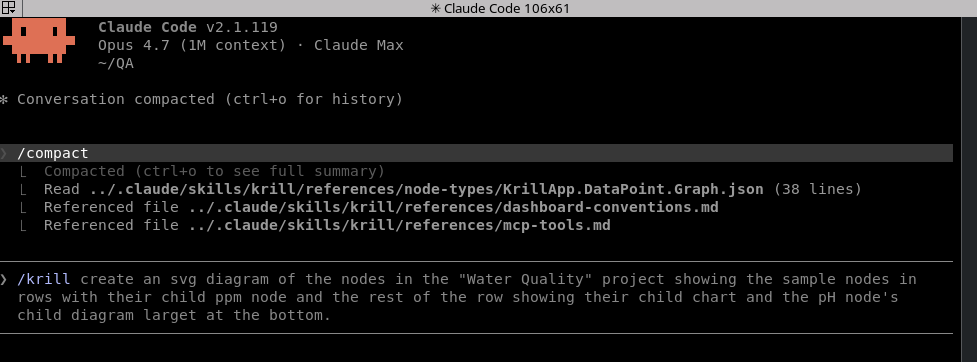 That’s the whole skill install. Restart Claude (or /skills reload in Claude Code) and the krill skill is available — Claude pulls it in automatically when your prompt mentions a Krill swarm, a node type, or a dashboard.