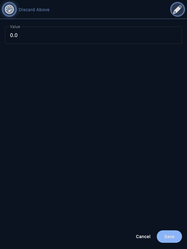 Discard Above filters out and ignores data point values that exceed a specified maximum value. This prevents outliers, sensor errors, or invalid high readings from being recorded or triggering automation. Useful for data quality control and removing noise from measurements.