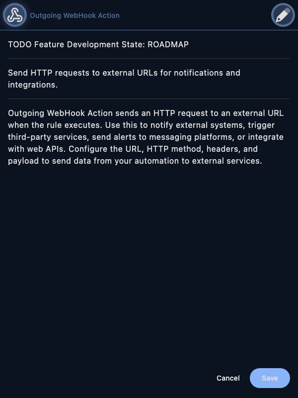 Outgoing WebHook Action sends an HTTP request to an external URL when the rule executes. Use this to notify external systems, trigger third-party services, send alerts to messaging platforms, or integrate with web APIs. Configure the URL, HTTP method, headers, and payload to send data from your automation to external services.