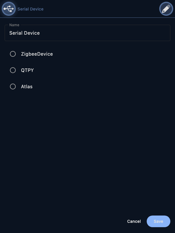 Serial Device support enables communication with hardware devices connected via serial ports (USB, UART). This feature provides integration with various serial-based sensors, microcontrollers, and IoT devices including Zigbee networks and QTPY boards. Serial devices can send data to data points and receive commands from the automation system.