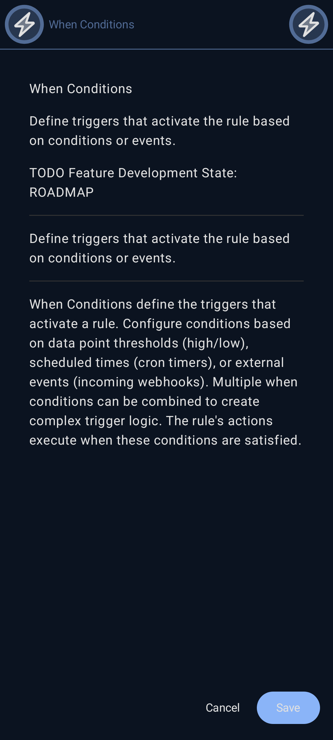 When Conditions define the triggers that activate a rule. Configure conditions based on data point thresholds (high/low), scheduled times (cron timers), or external events (incoming webhooks). Multiple when conditions can be combined to create complex trigger logic. The rule's actions execute when these conditions are satisfied.